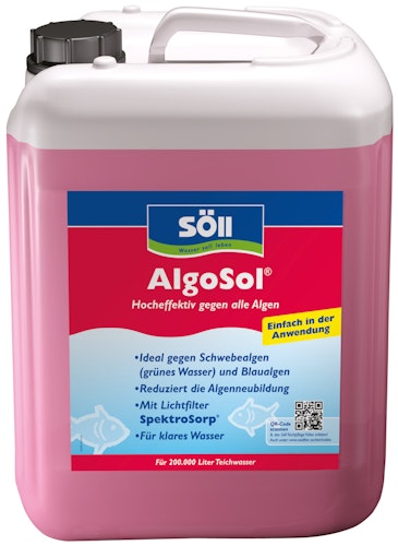 Die nachhaltige Unterdrückung von Algenmassenentwicklungen ist eine wichtige Voraussetzung für ein biologisches Gleichgewicht im Gewässer. AlgoSol wirkt aktiv gegen alle Algenarten, dämmt Algenmassenentwicklungen und eine einseitige Vermehrung von einzelnen Algenarten in Teichen zuverlässig ein. Insbesondere bei einzelligen Grünalgen sowie bei der vorbeugenden Behandlung und Unterdrückung von Blaualgen erzielt AlgoSol ausgezeichnete Erfolge. AlgoSol tötet Algen nicht sofort ab, da es durch die Zersetzung des organischen Materials sonst zu einer enormen Sauerstoffzehrung kommen würde. Die Wirkstoffe in AlgoSol führen zu einem langsamen Absterben der Algen, wodurch die Wirkzeit mehrere Tage in Anspruch nehmen kann. So wird das biologische Gleichgewicht im Teich bewusst gewahrt. Zusätzlich verringert der Lichtfilter SpektroSorp die Lichtausbeute der Algen und somit ihre Photosynthese-Tätigkeit. Die Algen "verhungern" nach und nach. AlgoSol unterbindet die schädlichen Auswirkungen des Algenstoffwechsels, so z.B. den übermäßigen Verbrauch an Karbonathärte und starke pH-Wert-Schwankungen. Bei regelmäßiger Anwendung wird einem erneuten Algenwachstum effektiv vorgebeugt. AlgoSol ist frei von Huminsäuren und beeinflusst die Leistung Ihres Filters nicht.