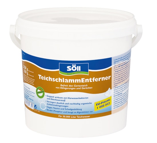Der Söll TeichschlammEntferner ist doppelt wirksam mit Aktivsauerstoff und Klarwasserbakterien – und das bis zu 8 Wochen lang! Komponente A (rein mineralisch): Reduziert organischen Teichschlamm. Durch die Mineralienkombination wird die Sedimentschicht aktiv oxidiert und somit abgebaut. Schwermetalle und andere fischgefährliche Stoffe sowie Phosphat, die Nahrungsgrundlage für Algen, werden gebunden. Das Resultat ist eine sichtbar geringere Schlammschicht. Faulige Gerüche werden sofort neutralisiert. Komponente B (rein biologisch): Bakterien sorgen für klares Wasser. Die hochaktiven Mikroorganismen beginnen umgehend mit dem Abbau von Schlamm, abgestorbenen Algen, Pflanzenresten, Laub und Fischgiften. Sie sorgen somit für klares, gesundes Teichwasser.